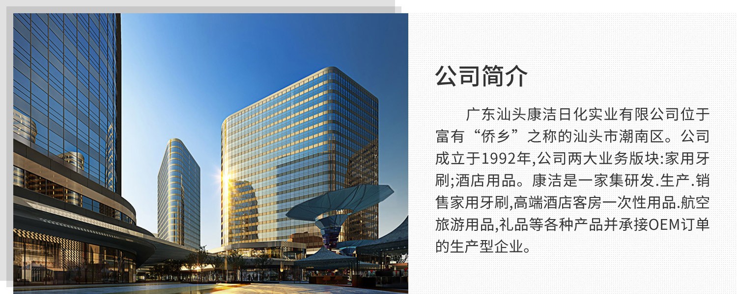 • 汕頭康潔日化實業(yè)有限公司是一家集研發(fā).生產.銷售高端酒店客房一次性用品等各種產品并承接OEM訂單的生產型企業(yè)。